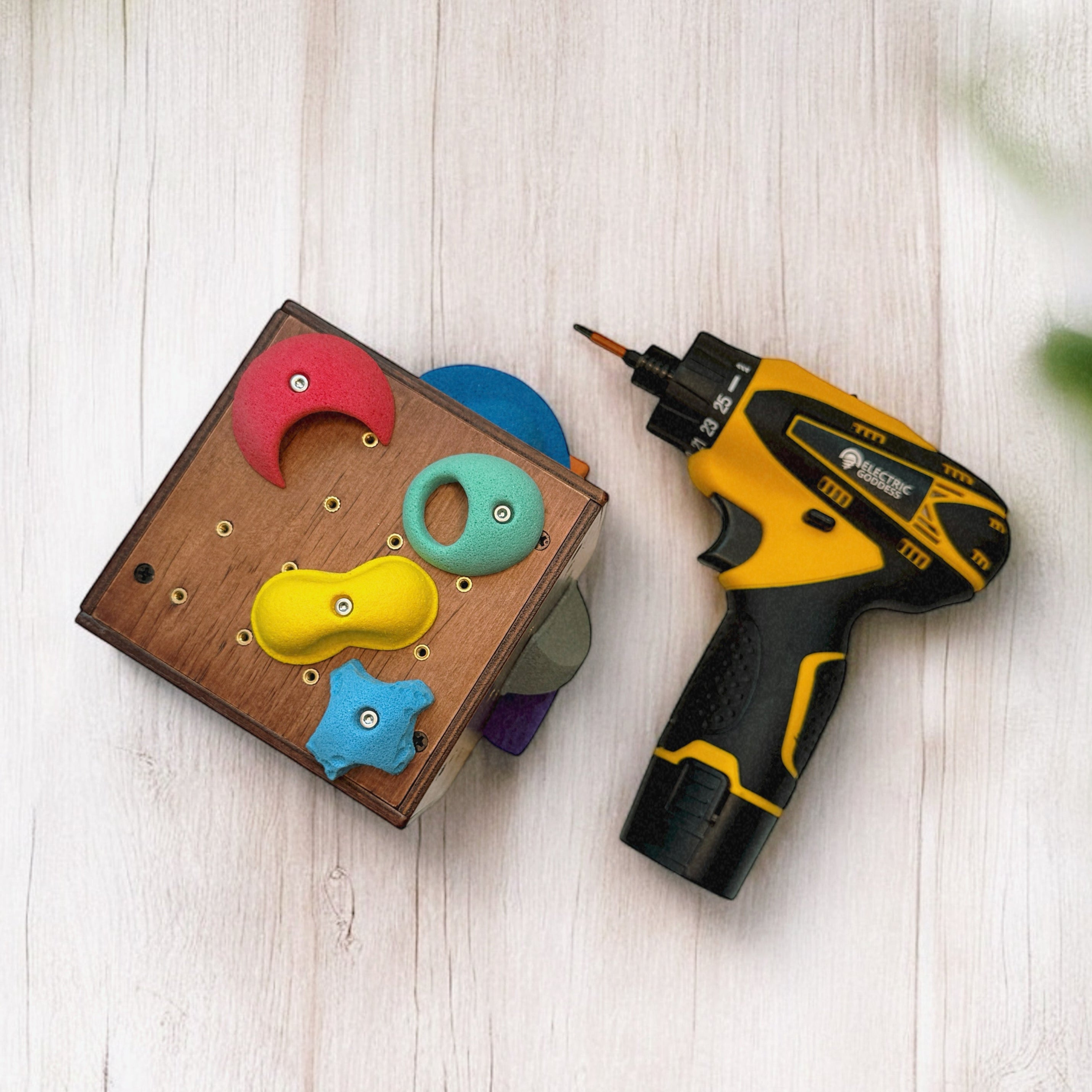 Not just training. Real climbing — in your hands. Boulder Cube was born from a simple but powerful idea: What if you could recreate the thrill of real climbing — anytime, anywhere — with just one hand? Inspired by professional route setters and crafted with the same care climbers bring to the wall, Boulder Cube delivers a true climbing experience — in the palm of your hand. From the plywood cube to each handcrafted hold, every detail is designed to capture the feel and challenge of real climbing. With realistic textures, adjustable angles, and fully customizable problems, Boulder Cube isn't just a tool. It's your personal climbing world. A space to create. To challenge. To grow stronger. The full set includes a handcrafted cube, 10 holds, bolts, a power driver, a canvas bag, and start/top stickers — everything you need to climb on your terms. Every unit takes hours to make and is produced in limited quantities — not because it has to be, but because it deserves to be. This isn't a toy. It’s a training system — for real climbers. And it was made for you.